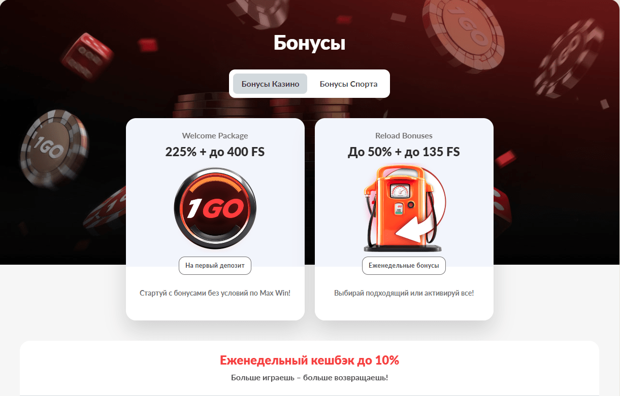 1Go – онлайн казино, в котором собраны игровые автоматы, ставки на спорт, лайв дилеры и многое другое. Прямо сейчас администрация раздает приветственный бонус на первые три депозита и множество акций. Поэтому у вас есть возможность получить дополнительные деньги и приступить к ставкам с выгодными условиями. Помимо различных промо проект может похвастаться удобным сайтом и качеством обслуживания.